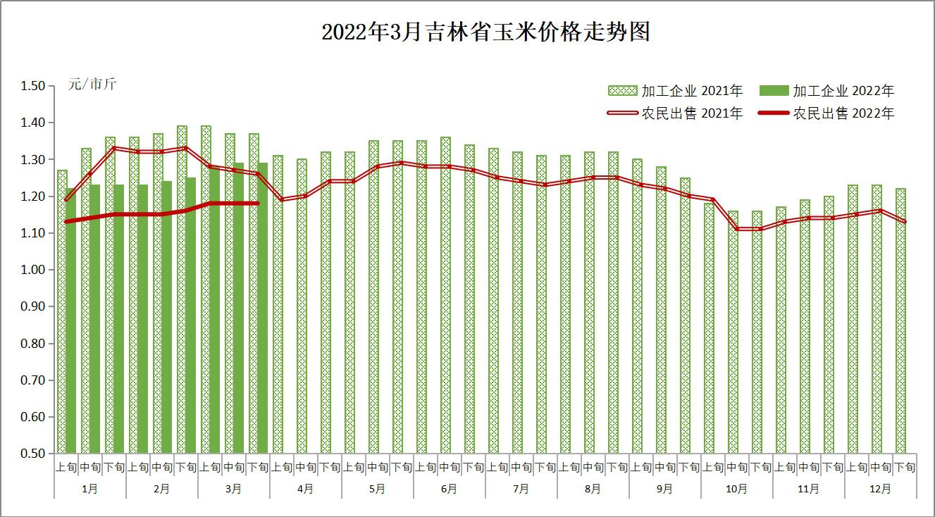 3月,上旬省内基层贸易商和经纪人收购比较积极,收购主体明显增多,玉米价格出现上涨趋势;中下旬局部区域交通受限,玉米价格大体稳定,市场贸易活跃度偏低。据12316热线平台不完全数据统计,3月省内农民出售标准水玉米月均价(元/市斤,下同)为1.18,环比上涨0.02、提高1.72%,同比下降0.09、降低7.09%。全省各地区农民坐家出售标准水玉米价格范围为:四平1.21-1.27,长春1.15-1.23,松原1.14-1.25,白城1.13-1.24,通化1.13-1.23,辽源1.11-1.24,吉林1.09-1.23,延边州1.07-1.22,白山1.05-1.17。